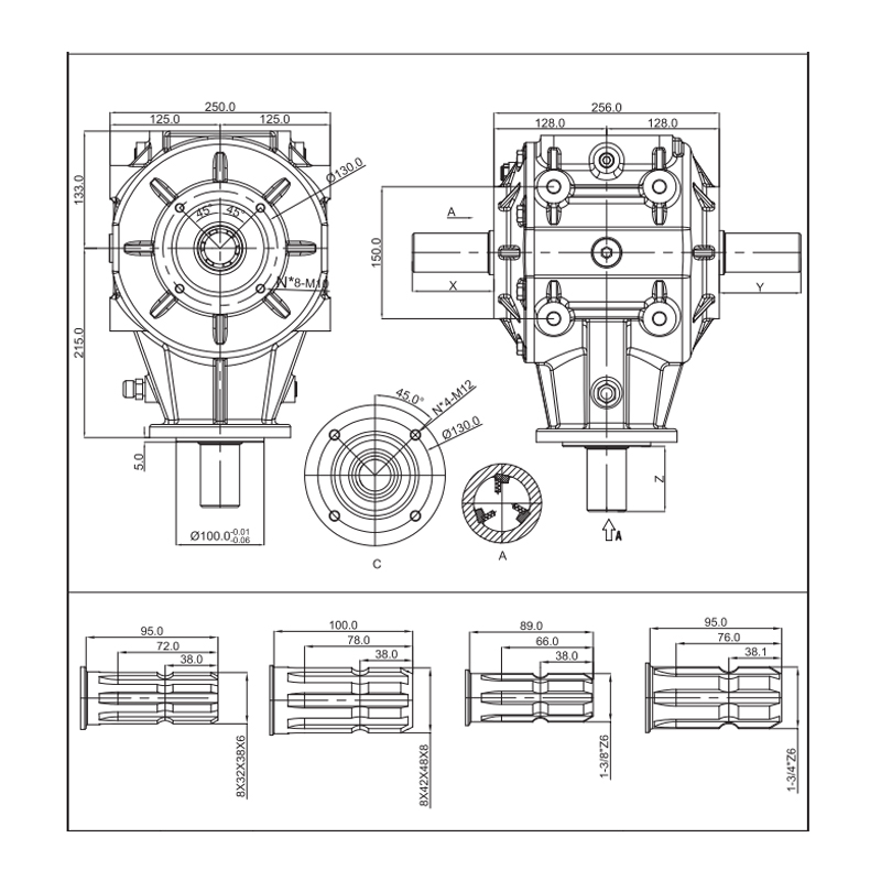 কেএলএফ 250 স্পিড-ইনক্রিজিং ট্রান্সমিশন অনুপাত 1: 3, এটি বিভিন্ন ধরণের কৃষি যন্ত্রপাতি এবং সরঞ্জাম, মুলচার স্ট্র ক্রাশার মেশিন, কৃষি অবশিষ্টাংশের চলচ্চিত্র পুনরুদ্ধার মেশিন ইত্যাদির সাথে খাপ খাইয়ে নেওয়া যেতে পারে। গ্লিসন বেভেল গিয়ারগুলি উচ্চ নির্ভুলতা সহ উচ্চতর জালিয়াতির নির্ভুলতা, ছোট সংক্রমণ ক্ষতি এবং উচ্চ শক্তি স্থানান্তর দক্ষতা সহ প্রক্রিয়া করা হয়। ইনপুট গতি 540 আর/মিনিট, আউটপুট গতি 1620 আর/মিনিট, রেটেড পাওয়ার 80HP, সর্বাধিক পাওয়ার 100HP